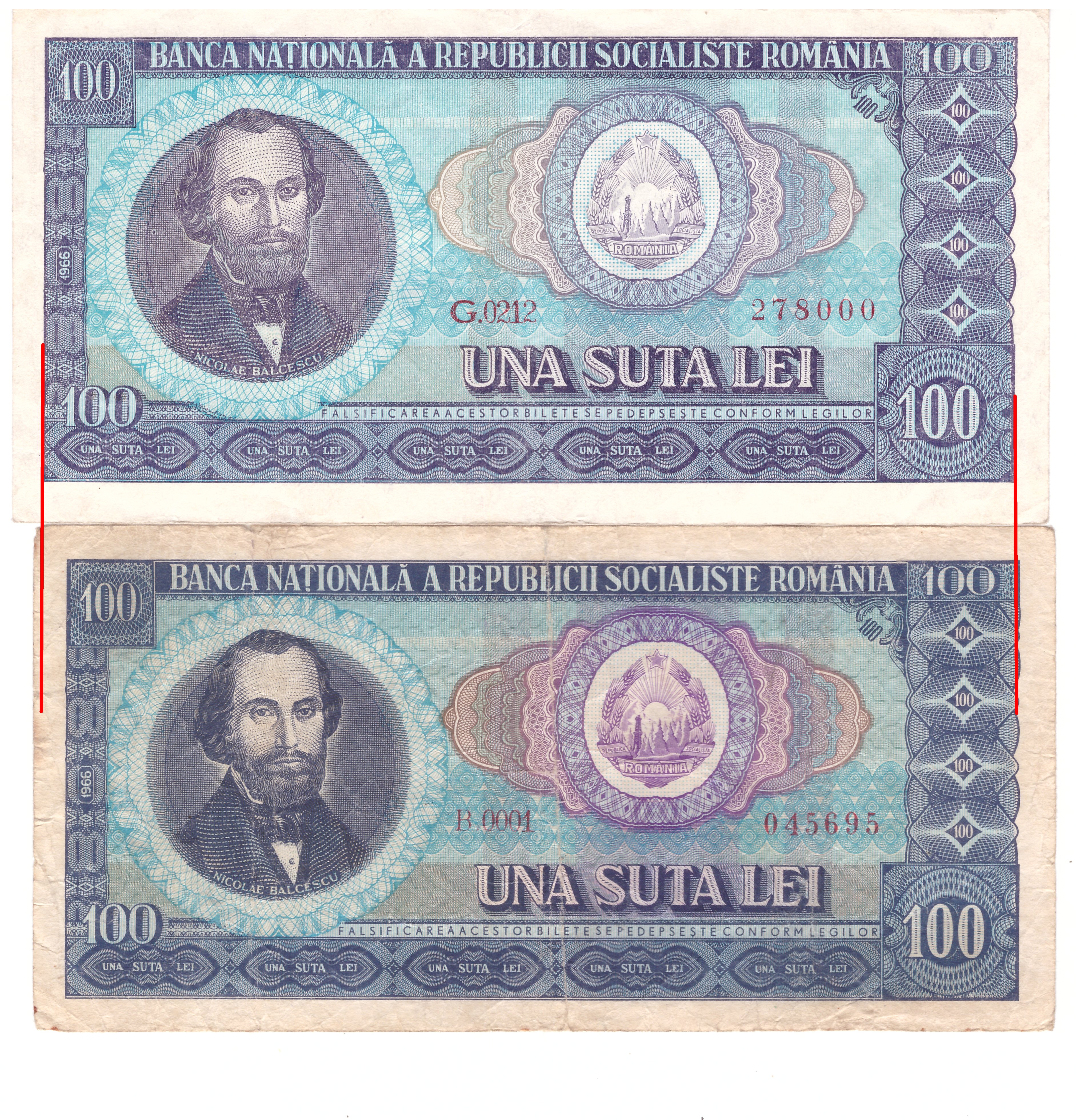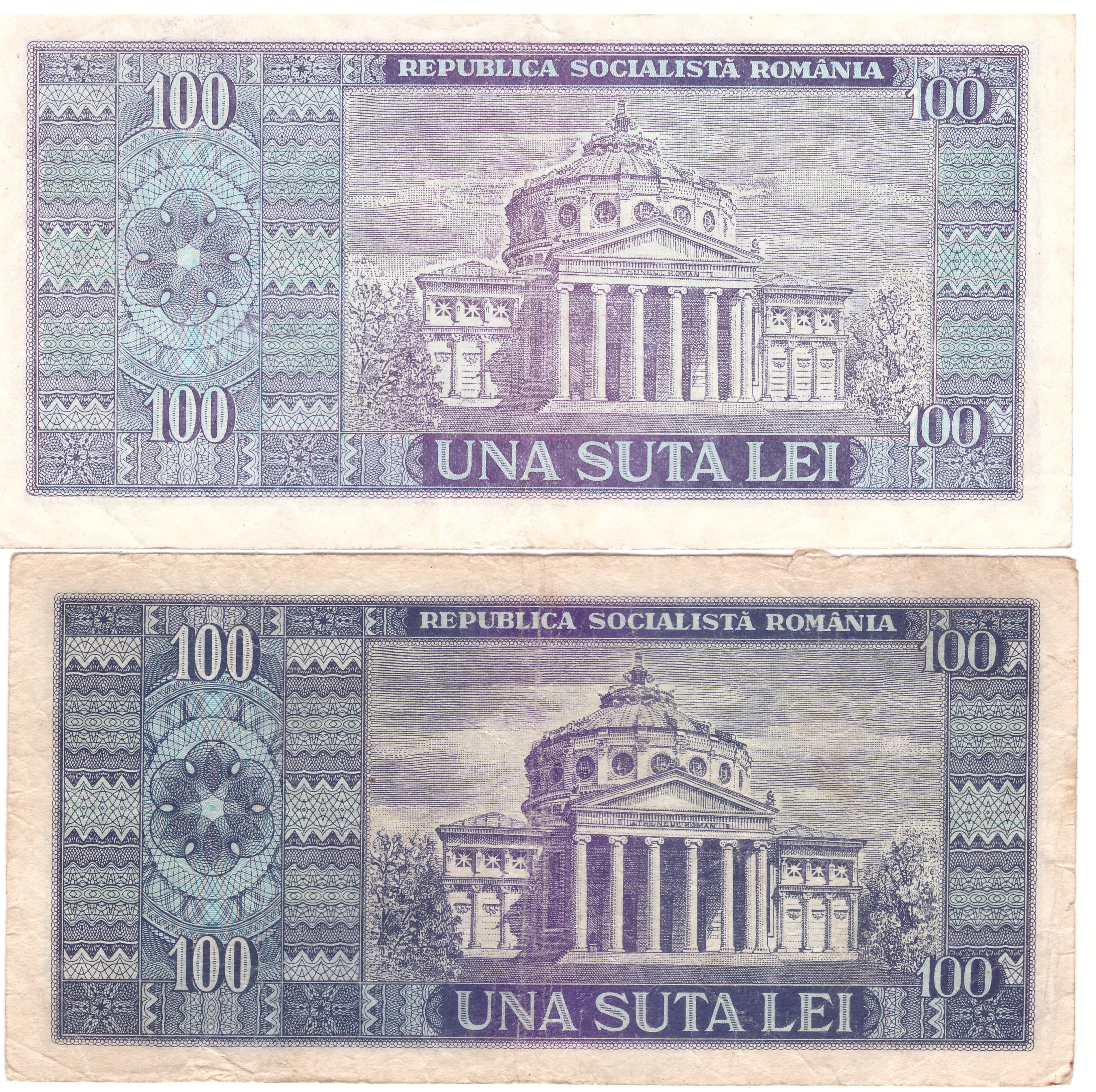 Un 100 lei 1966 (dupa parerea mea) fals de epoca, foarte foarte bine realizat. Sunt diferente la dimensiunea desenului, nuantele culorilor. La desen diferentele sunt foarte marunte, aproape insesizabile.