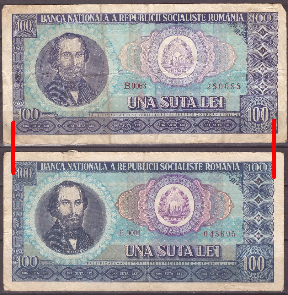 Alek scrie:Exista diferente mari de tiparitura la bancnotele de 100 lei 1966, vizibile mai ales la norii de deasupra Atheneului Român. La unele dintre ele, tiparitura este deosebit de grosolana, la altele este foarte fina. Voi trimite scanurile a doua bancnote din colectia mea, la care aceasta diferenta este flagranta. Cunoaste cineva mai multe detalii ale acestei probleme?