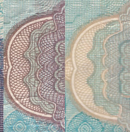 Mai am si una cu seria B01010, sunt aceeasi diferente la dimensiunea desenului si acolo, 3mm pe orizontala si cam 1mm pe verticala. Se vede destul de bine si diferenta la culoare. Daca s-a intervenit pe design in timp, ma mir ca nu au aparut probleme la magazine la plati si nu au fost chemati militienii fecvent, cu suspiciune de bancnota falsificata.