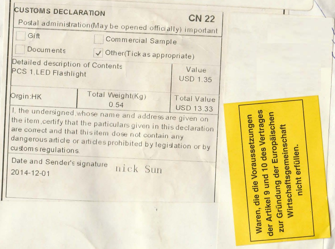 Iată şi o combinaţie de CN 22 şi etichetă galbenă, ridicată de la oficiul poştal. Dacă ar fi de ridicat acum, ar veni în vamă şi ar fi peste 10 euro (se plăteşte TVA).