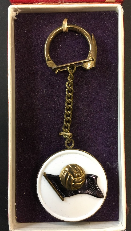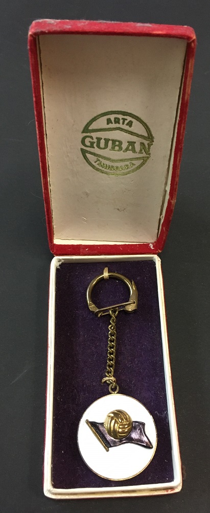 Este realizat din alama, are diametrul de 30 mm, emailat in alb si violet. Reversul este convex si neemailat.