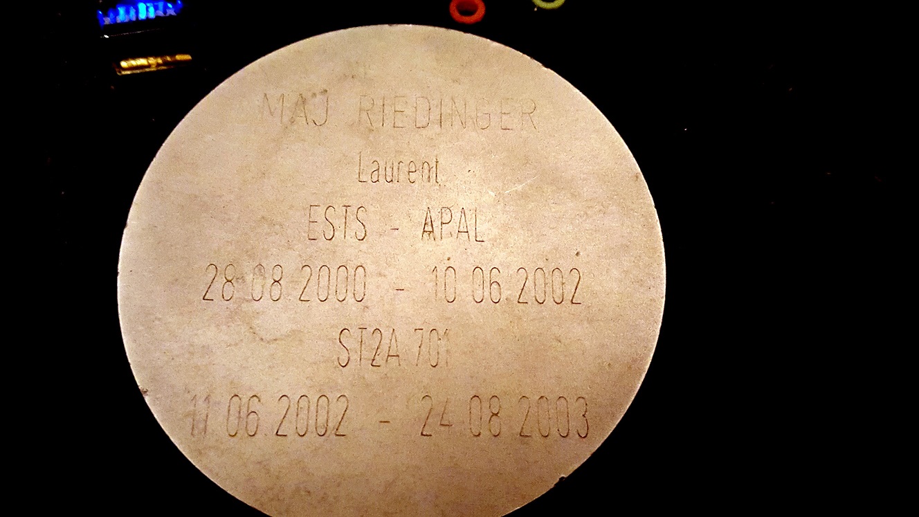 Riedinger Laurent a fost responsabil al atelierului de întreţinere aeronautică la Ecole militaire de l’air et de l’espace (Salon-de-Provence) în perioada August 2000 – August 2003 (exact perioada inscripţionată pe jeton)