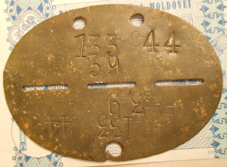 Recent am procurat plăcuța de identificare -din imagine.Diam/-33 mm. 3,35 gr.Dacă poate cinevai să mă ajute a identifica persoana cui a aparținut -sunt interesat -pentru că aș dori să o dăruesc familiei -urmașilor acestui ostaș și a putea afla despre această persoană careva informații despre viața și soarta acestuia. Voi fi f.recunoscător pentru ajutorul acordat.