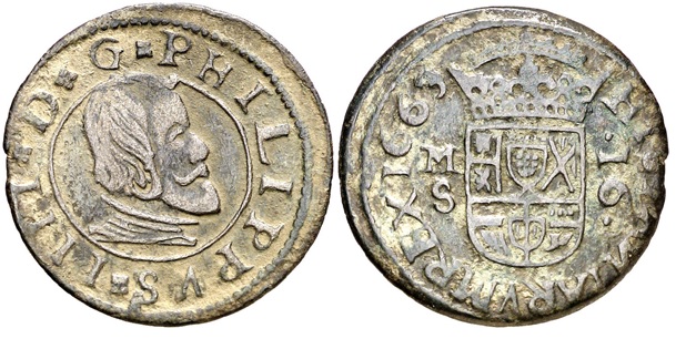Aceasta este o monedă, în mica parte asemănătoare, cu cea pe care doresc sa o identific, cam din aceeași perioadă:<br />1663. Felipe IV. Burgos. R. 16 maravedís. (Cal. 1249) (J.S. M-4). 3,86 g. Busto grande. MBC.