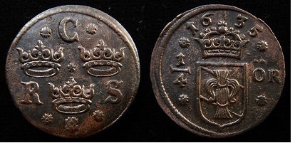am găsit moneda.<br /> 1/4 Öre -- 1635 - 1636 -- Type II, Date Above Crown -- Type #28<br />Mint: Nyköping and Säter,   References: KM 152.2, SM 123-124<br />29-30 mm, 10.6 gm<br />oricum mi-au fost de folos sfaturile de pe acest forum.<br />multumesc mult.
