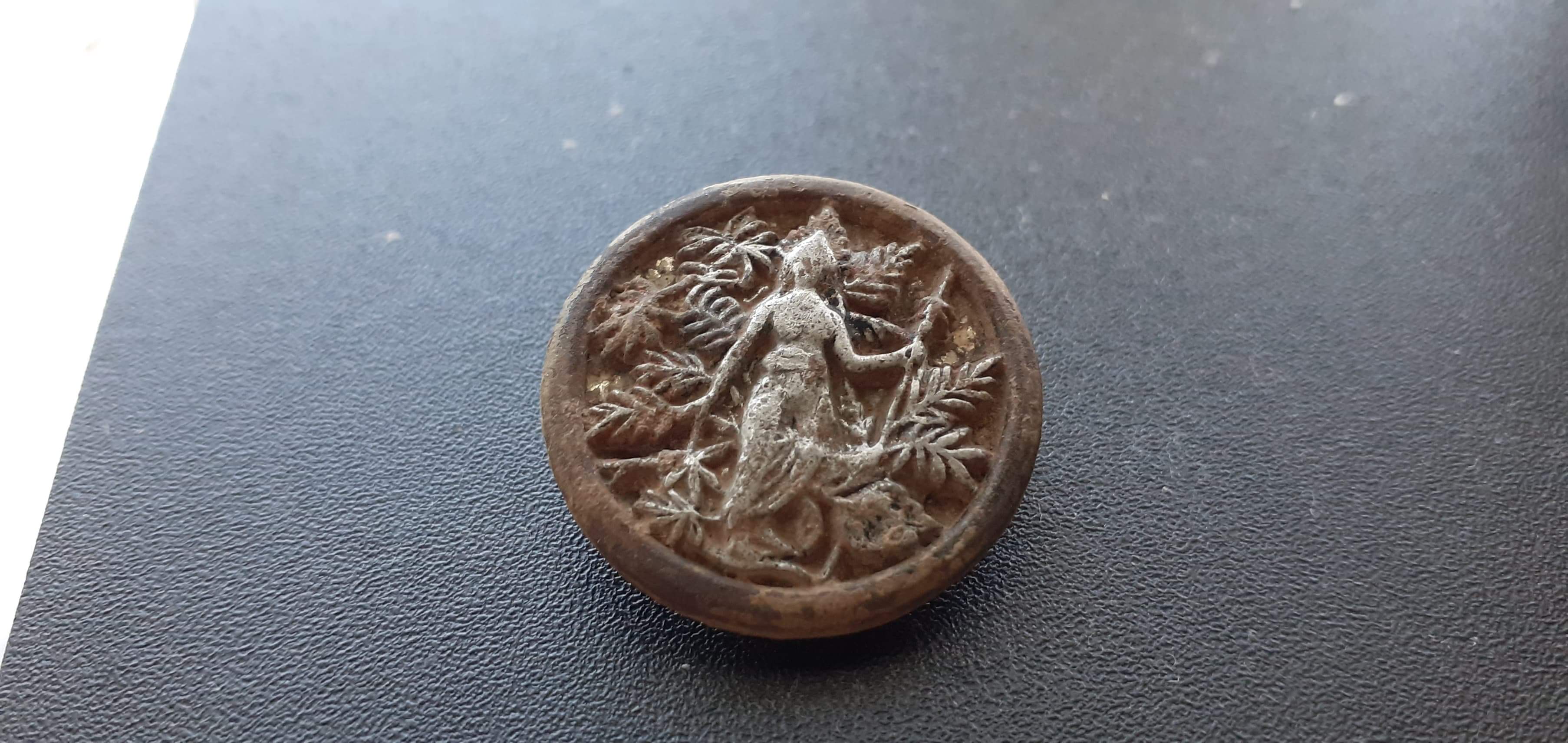 Rog o identificare a acestui nasture daca se poate.Gasit in pamant cu detectorul.Nu am gasit nici un fel de informatii despre el.