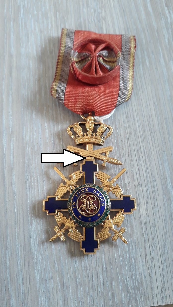 Ordinul se putea conferi cu spade duble cand militarul respectiv primise deja crucea pt. merite pe timp de pace si urma sa primeasca alta pt. merite de razboi.