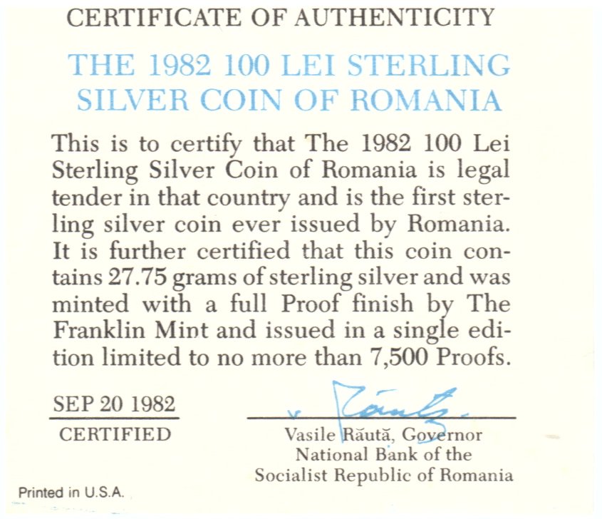Certificatul poarta semnaturile guvernatorului BNR si a chairului monetariei din acea vreme - nume confirmate de sursele disponibile pe internet. Din pacate nu este asa usor sa validez semnaturile - macar in principiu.