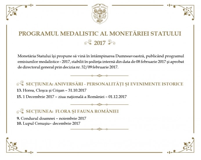 MS pare să dorească să continue Programul medalistic 2017, acum (ianuarie 2018) s-au lansat cele 2 seturi legate de poziţia 13 (programată pentru 31.10.2017) Horea, Cloșca și Crișan http://monetariastatului.ro/horea-closca-si-crisan/