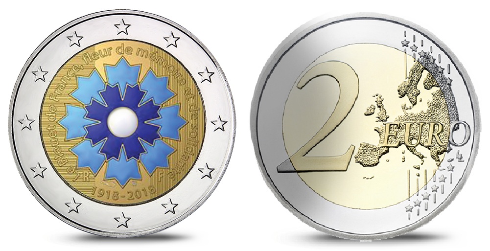 Dans le cadre de cette commémoration, la Monnaie de Paris émet une pièce de 2 euro au Bleuet en versions BU et BE. Les pétales sont colorisés dans deux teintes de bleus. Sur cette pièce sont inscrits: Le Bleuet de France, fleur de mémoire et de solidarité, avec les dates 1918 -2018 et RF. Création de Joaquin Jimenez