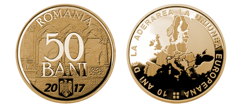 Am acum un ultim exemplu, cel al monedei „comemorative” de circulaţie 10 ani de la aderarea României la UE, emisiune 2017.