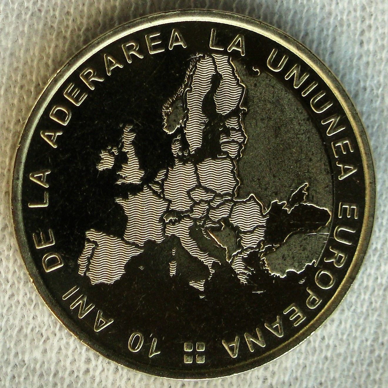 „Reversul [...] prezintă statele Uniunii Europene evidențiate în mod distinct și inscripția circulară „10 ANI DE LA ADERAREA LA UNIUNEA EUROPEANĂ”.”
