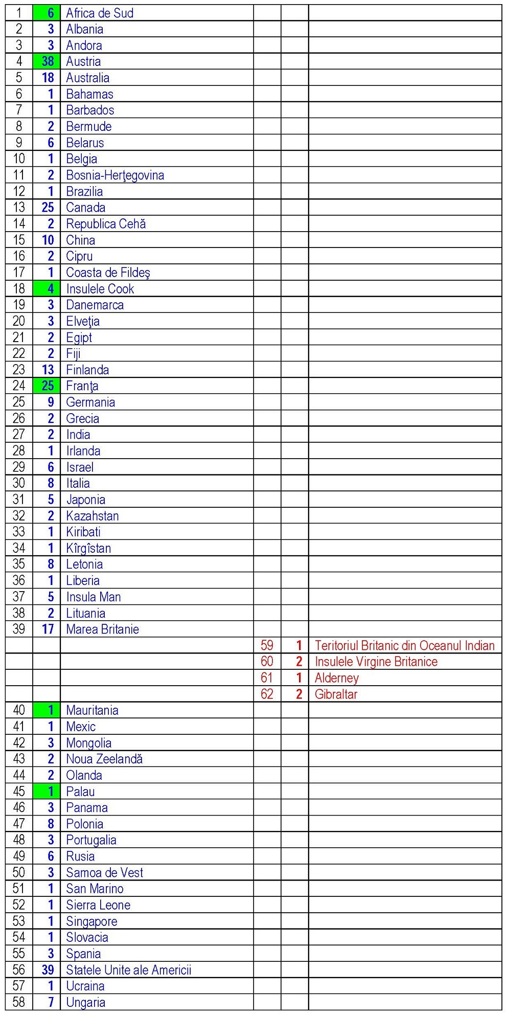 Am marcat cu highlight verde ţara care a avansat pe o categorie nouă în actualizarea pe 2019 (Africa de Sud, Austria, Insulele Cook, Franţa, Mauritania, Palau şi Statele Unite ale Americii).
