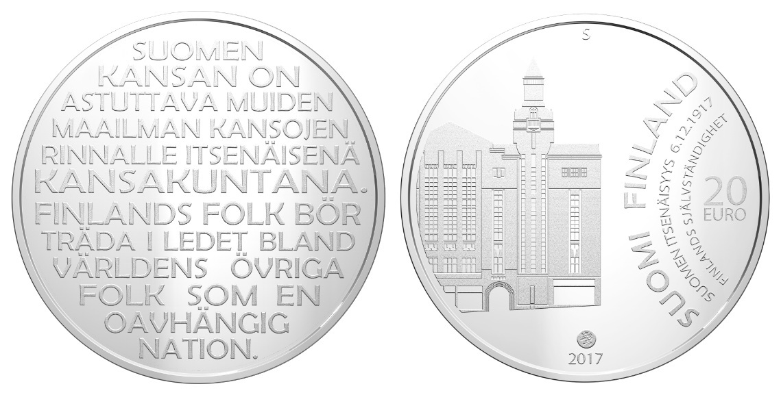 O monedă comemorativă a fost emisă pentru a onora cea de-a 100-a aniversare a zilei independenţei Finlandei, 6 decembrie 2017. Pe avers se află un fragment în limbile finlandeză şi suedeză din declaraţia de independenţă a Finlandei. Reversul monedei pentru numismaţi prezintă clădirea Heimola (contruită în stil Art Nouveau), care se afla în Helsinki.