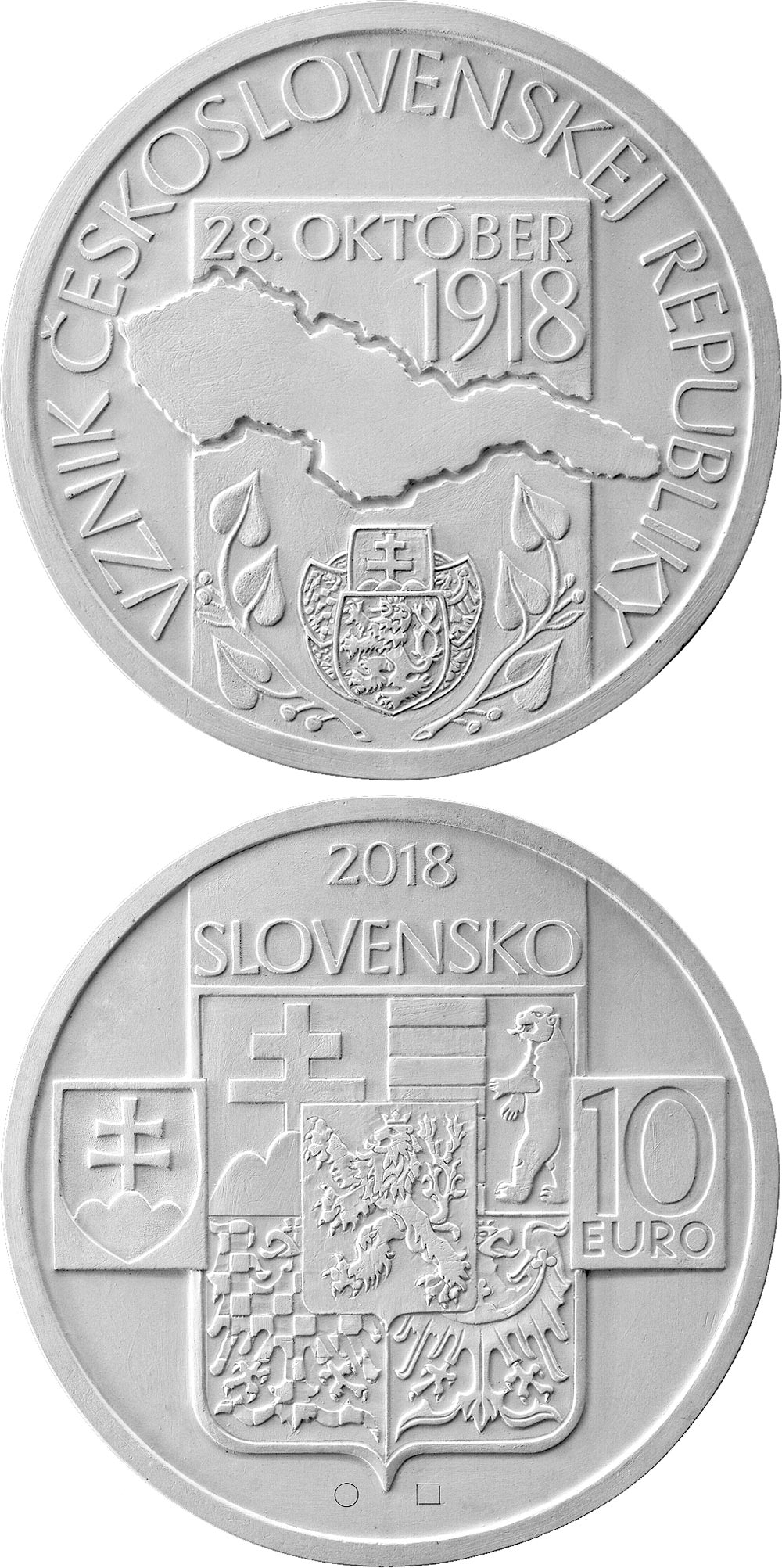 „În iulie 2017, Banca Naţională a Slovaciei (BNS) a anunțat o competiție publică pentru proiectarea unei monede de 10 euro de colecţionare din argint care marchează cea de-a 100-a aniversare a fondării Republicii Cehoslovace (CSR). În concurs au fost înscrise 12 modele de la nouă designeri. În octombrie 2017, desenele au fost evaluate în mod anonim de către Comitetul pentru evaluarea modelelor de monede comemorative și de colecție al BNS. Comitetul a fost asistat de către un expert consilier, Matej Hanula, de la Institutul de Istorie al Academiei de Științe din Slovacia. Recomandarea Comitetului a fost ca un model al lui Patrik Kovačovský să fie folosit pentru monedă [premiul întâi] și să i se atribuie un premiu doi. Ca o condiție a recomandării sale, Comitetul a solicitat ca simbolurile boemiene și morave să fie poziționate pe verticală și ca stema Moraviei să fie redesenată astfel încât să fie corectă din punct de vedere heraldic. Comitetul a recomandat, de asemenea, acordarea unui premiu doi pentru proiectul lui Zbyňek Fojtů. În evaluarea acestor modele, Comitetul a menționat că fiecare prezenta armonie artistică și de conținut. Consiliul BNS a dat deoparte recomandarea Comitetului și a decis, în schimb, ca proiectul lui Fojtů să fie folosit pentru monedă. În același timp, a acordat premii doi modelelor [...] lui Kovačovský. În evaluarea modelului lui Fojtů, Comitetul a apreciat claritatea cu care reprezentase înființarea Republicii Cehoslovacia (CSR). Aversul este în mare parte umplut cu stema CSR. Pe verso, în centru, este o hartă a țării, iar sub ea este un simbol al viitorului CSR, folosit de legiunile cehoslovace pe câmpurile de luptă din primul război mondial. În ceea ce privește designul lui Kovačovský, Comitetul a luat notă de claritatea sa, de armonizarea compozițiilor avers și revers, precum și de reprezentarea clară a temei. Pe ambele părți, care au o parte superioară un decupaj în coadă de rândunică cu trimitere la steagul CSR, heraldica este folisită adecvat. Aversul prezintă, în partea superioară, stema Republicii Slovace și, în partea inferioară, stema CSR de dimensiuni mari. Reversul descrie emblema heraldică a Slovaciei în partea superioară și simbolurile Boemiei și Moraviei în partea inferioară.”