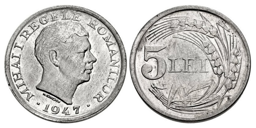 Revers: inscripţia MIHAI I REGELE ROMANILOR, efigia regelui privind spre dreapta şi anul 1947 încadrat între două pătrate. Sub gât inscripţia H. IONESCU (Haralamb Ionescu).