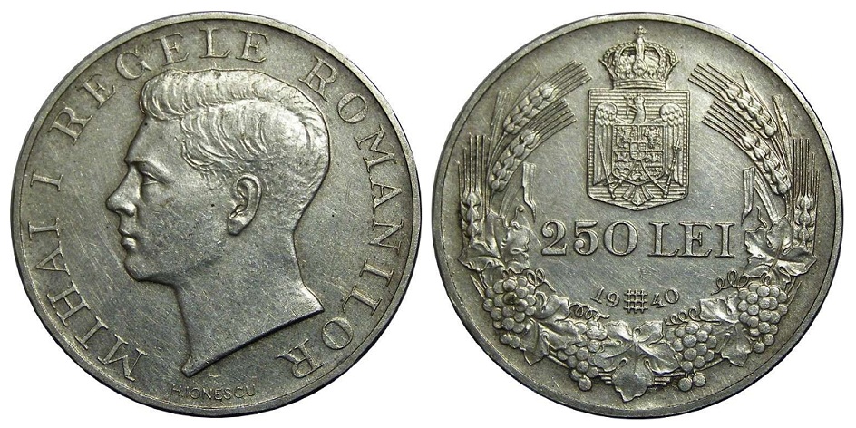 Monedele de 250 de lei bătute sub Mihai cu TOTUL PENTRU TARA pe muchie şi anul de pe avers sub forma 19#40 nu au fost puse în circulaţie, fiind topite (după autorii MBR). Ele au fost bătute începând cu 18 decembrie 1940. De fapt, semnul despărţitor dintre 19 şi 40 a fost elementul fatal acestei emisiuni. Era chiar semnul Mişcării Legionare, înlocuit pe această pagină printr-un #, cu care se aseamănă (mai lipseşte o cruce plasată pe mijlocul diezului). Rebeliunea din 21-23 ianuarie 1941, înăbuşită de mareşalul Ion Antonescu cu ajutorul armatei, a dus la interzicerea Mişcării Legionare şi, totodată, la distrugerea aproape totală a monedelor acesteia.