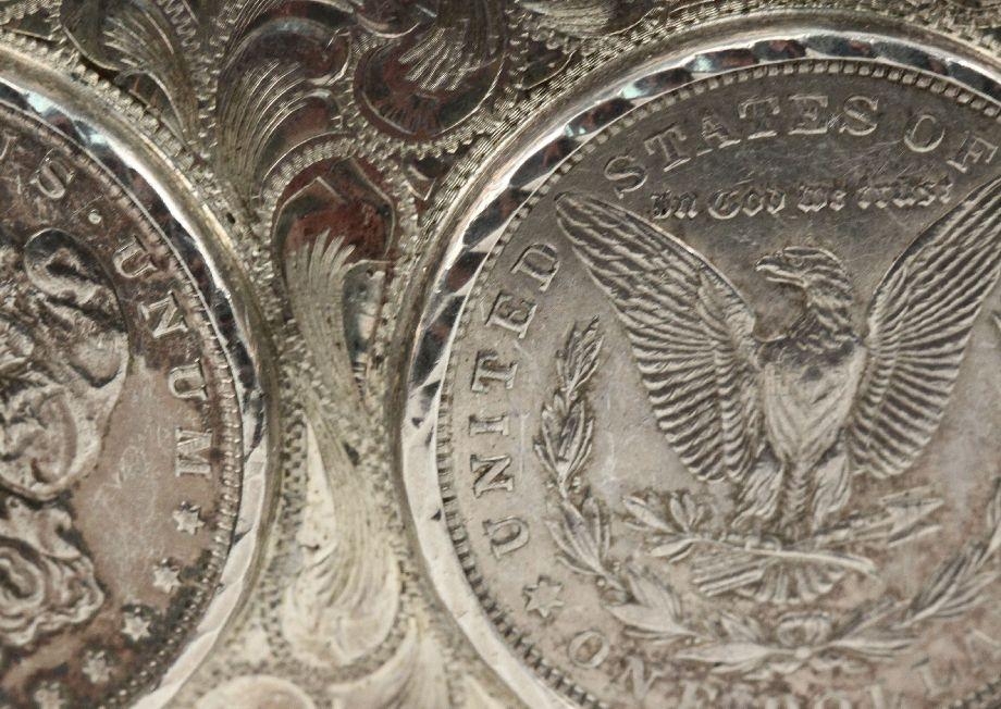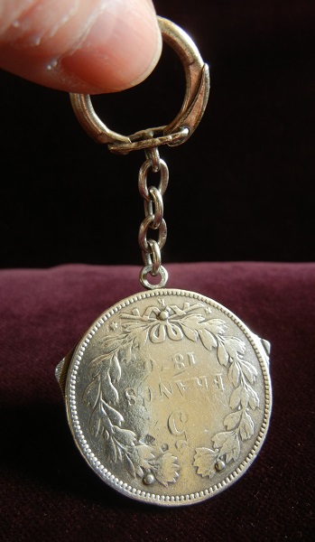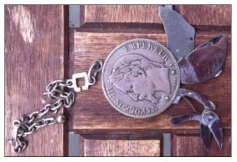 Este vorba despre o "pafta" cu totul ieşită din comun: o piesă de 1 dolar 1883 (Hawai) anturată de steme mici (Hawai, dar pe care nu le-am identificat ca provenienţă, cel puţin deocamdată).