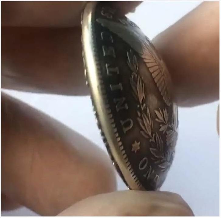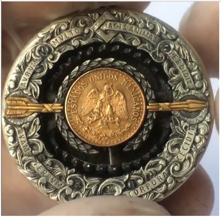 Using a Morgan silver dollar from 1921, the coin features a golden ‘bait coin’, a Dos Pesos from 1945. The coin also features gold inlays (the broken arrows) and a working trap jaw mechanism.