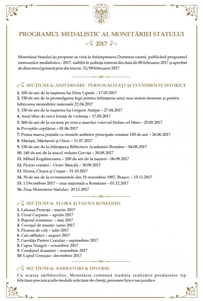 Re: PROGRAMUL MEDALISTIC AL MONETARIEI STATULUI 2017