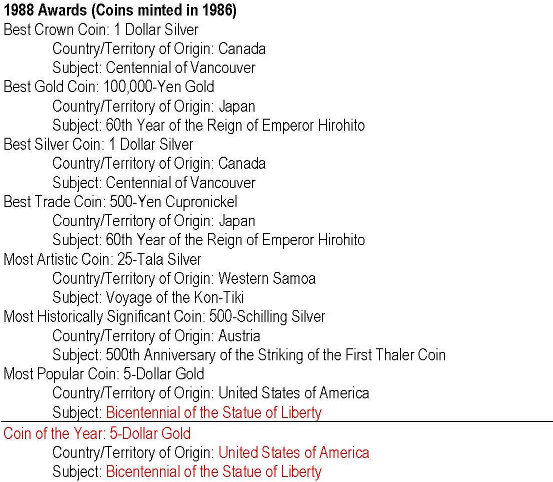 - anul 1988 cu monedele având nominal 1986; cu roşu: câştigătorul Coin of the Year -