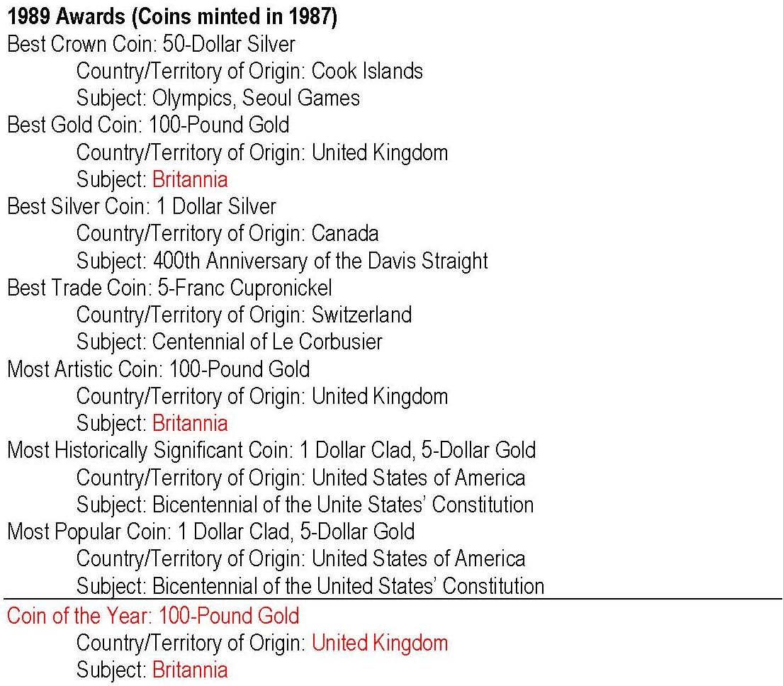 - anul 1989 cu monedele având nominal 1987; cu roşu: câştigătorul Coin of the Year -