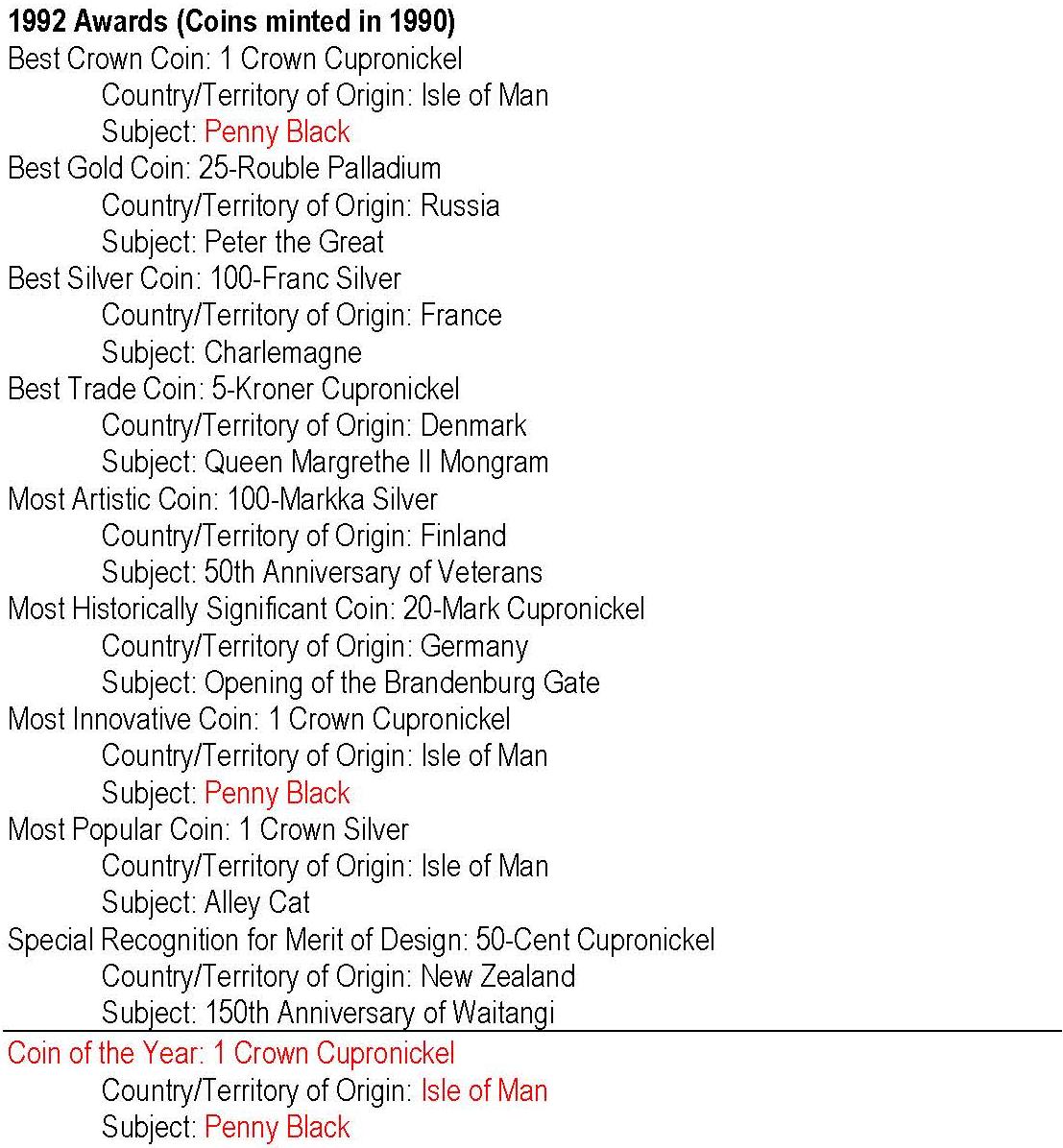 - anul 1992 cu monedele având nominal 1990; cu roşu: câştigătorul Coin of the Year -