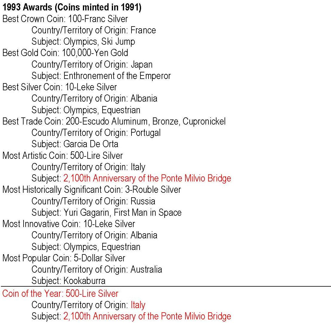 - anul 1993 cu monedele având nominal 1991; cu roşu: câştigătorul Coin of the Year -