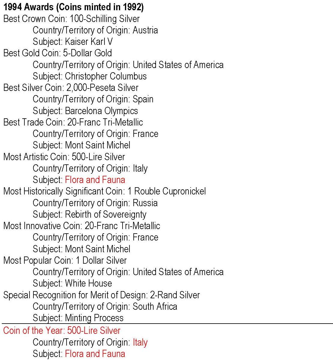 - anul 1994 cu monedele având nominal 1992; cu roşu: câştigătorul Coin of the Year -