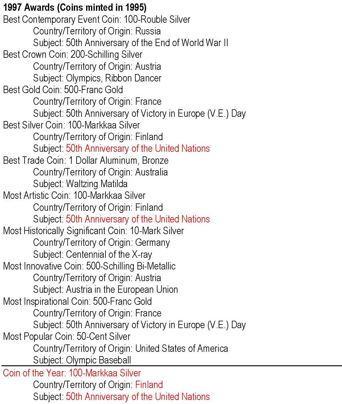 - anul 1997 cu monedele având nominal 1995; cu roşu: câştigătorul Coin of the Year -
