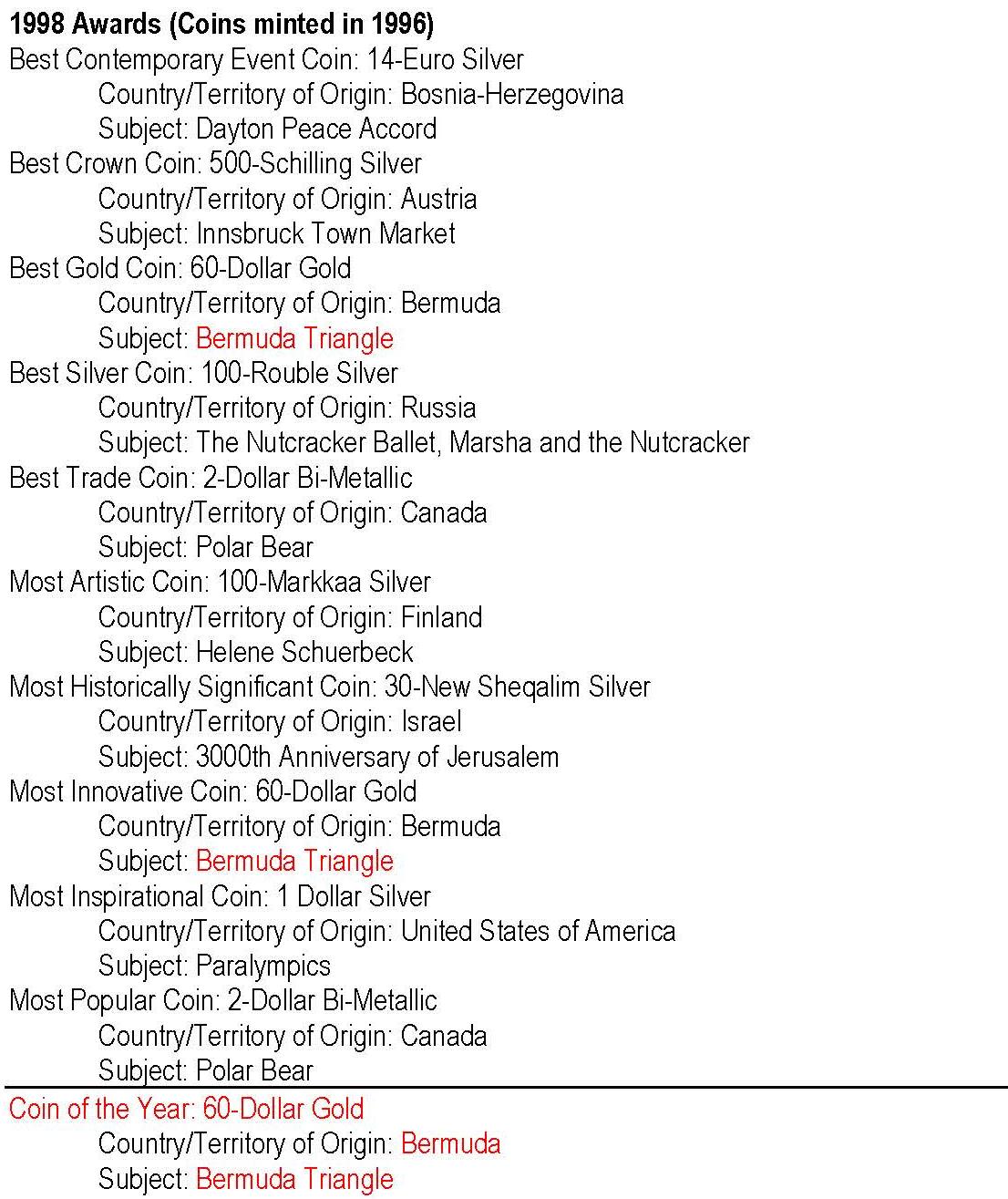 - anul 1998 cu monedele având nominal 1996; cu roşu: câştigătorul Coin of the Year -