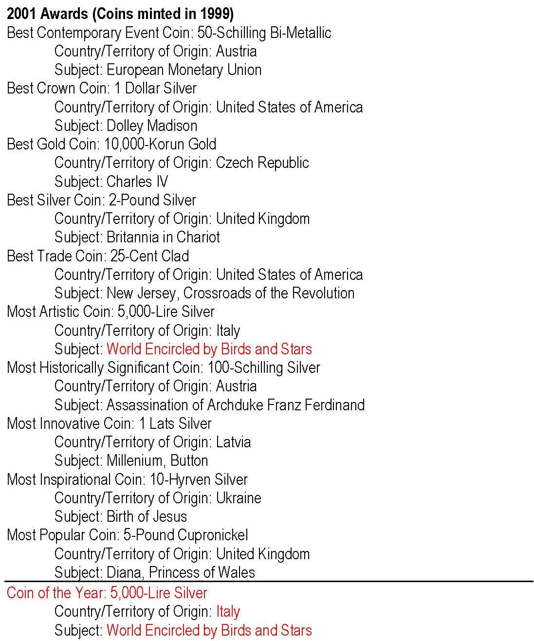 - anul 2001 cu monedele având nominal 1999; cu roşu: câştigătorul Coin of the Year -