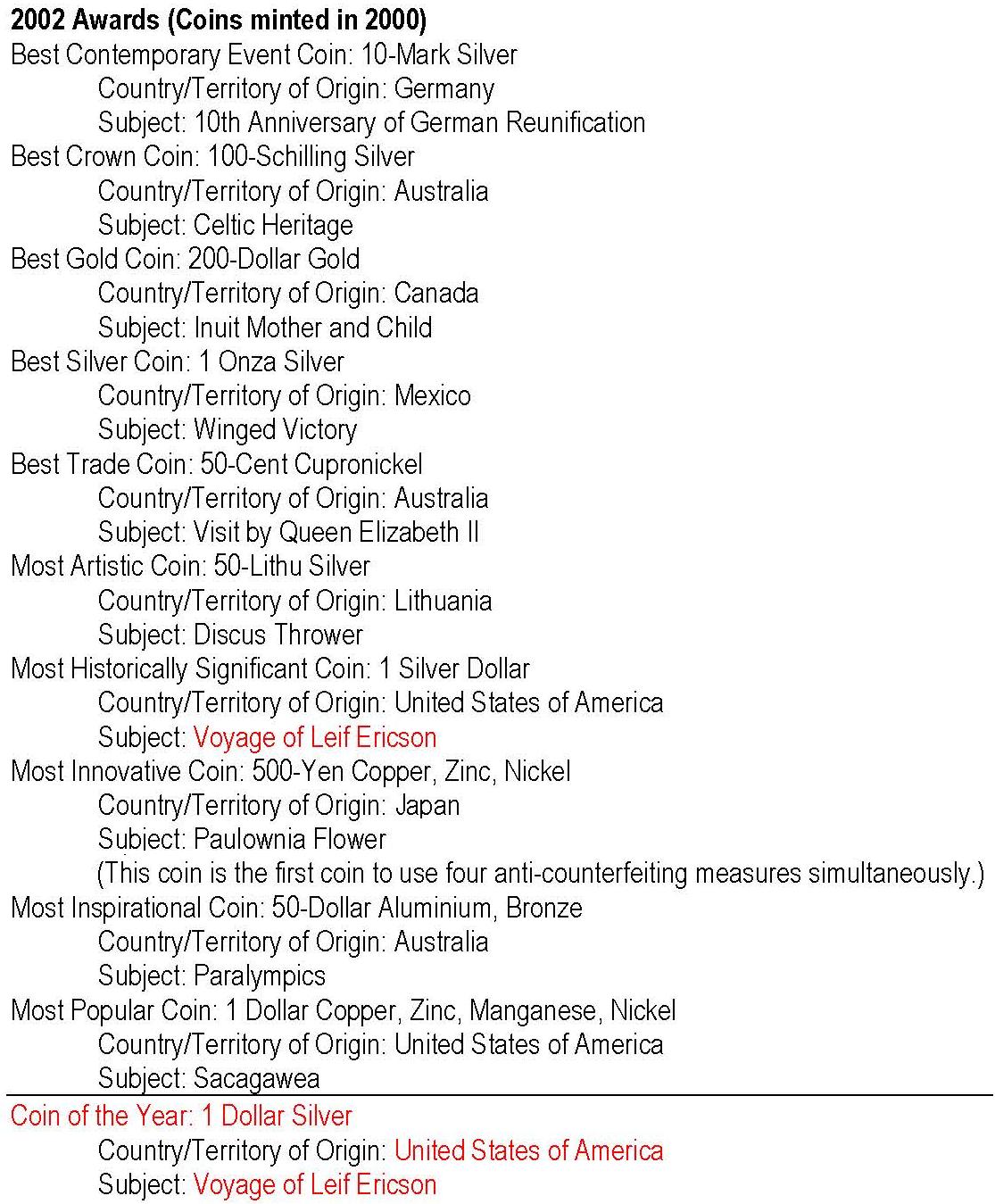- anul 2002 cu monedele având nominal 2000; cu roşu: câştigătorul Coin of the Year -