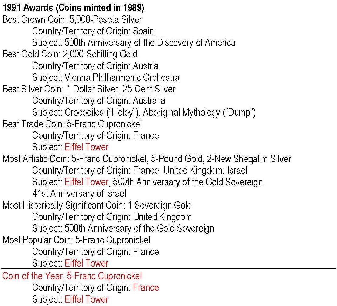 - anul 1991 cu monedele având nominal 1989; cu roşu: câştigătorul Coin of the Year -