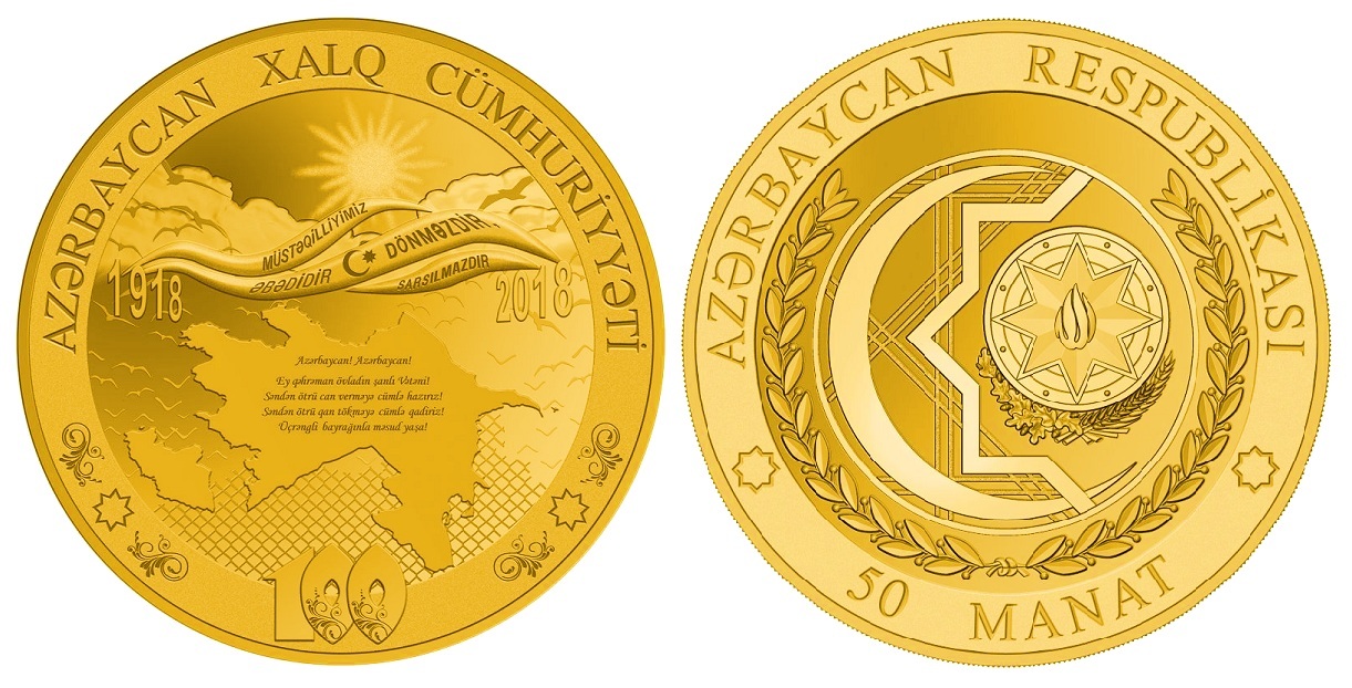 Banca Naţională a Republicii Azerbaidjan a emis 3 monede aniversare dedicate centenarului creării Republicii Populare a Azerbaidjanului (28 mai, 1918).