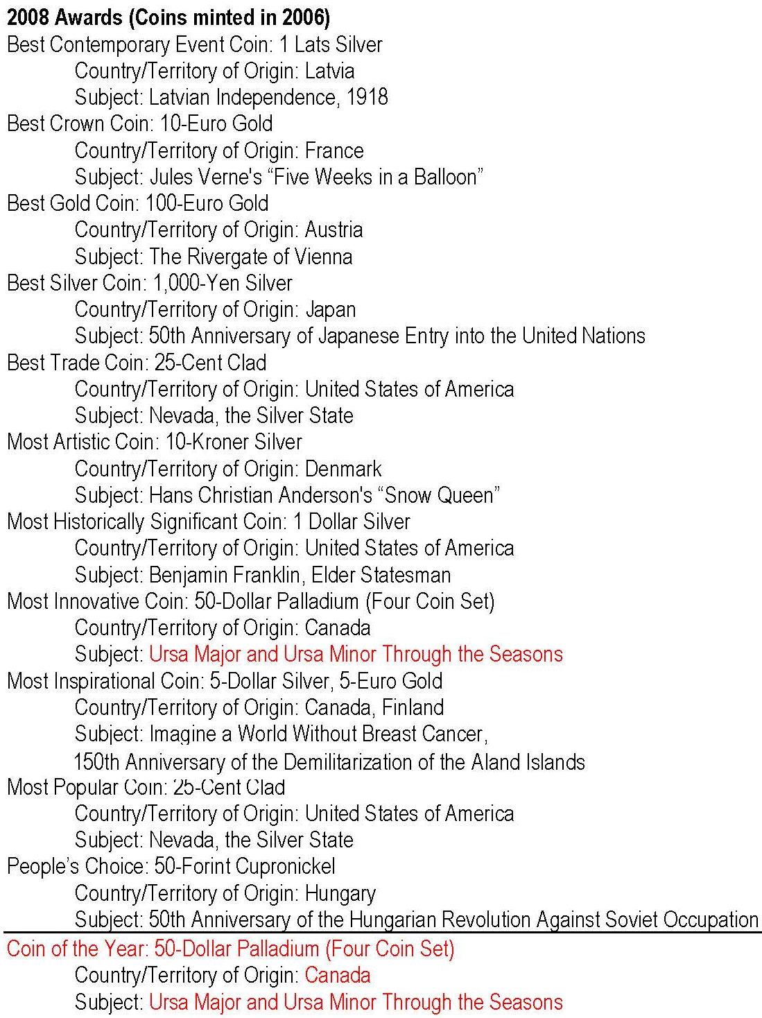 - anul 2008 cu monedele având nominal 2006; cu roşu: câştigătorul Coin of the Year -