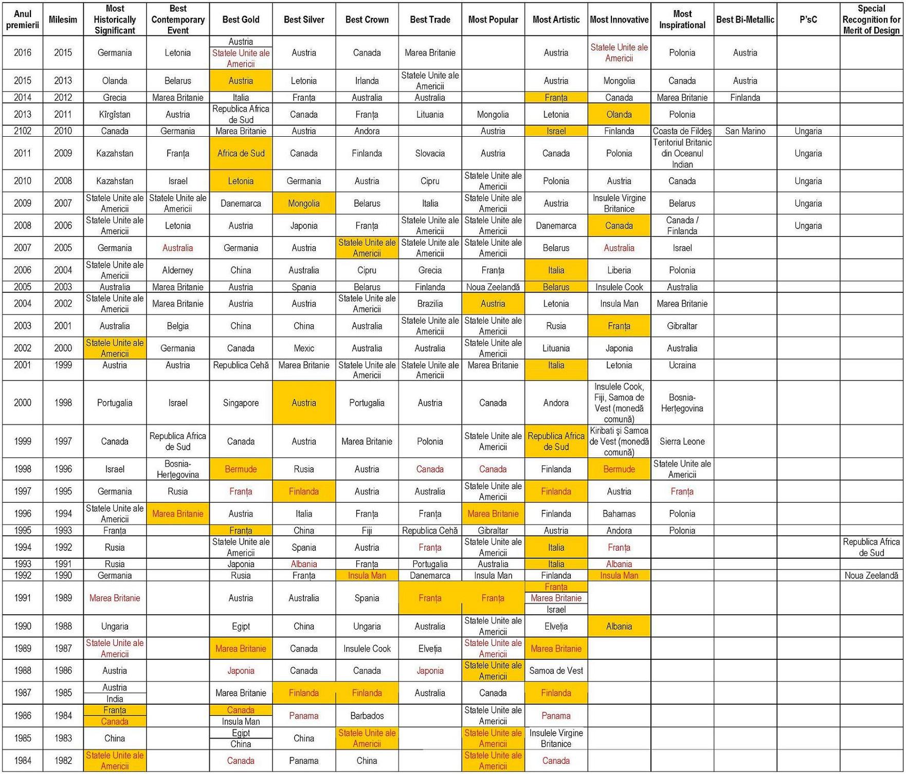 Dacă o monedă a fost premiată în 2 sau 3 categorii, atunci denumirea ţării care a emis-o este în roşu.