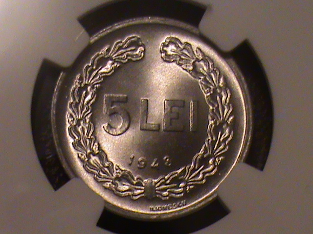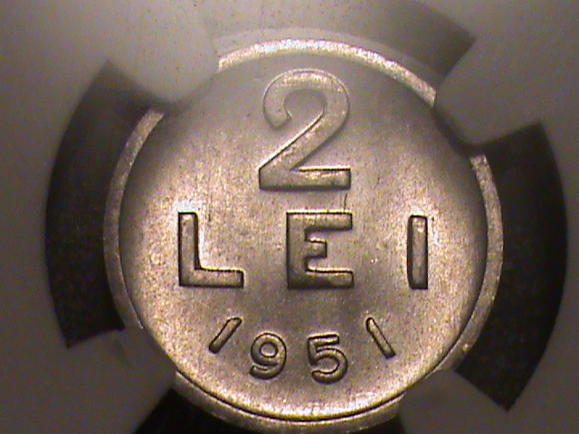 Mai apar si celelalte monede de aluminiu.5 lei 1951 mi se pare mie cea mai rara pentru ca e cea pe care am vazut-o eu mai rar.Aluminiu e moale si greu sa scape monedele fara contacte.Pozele mele nu ies asa bine.2 lei 1951 a luat si el 67 la NGC.