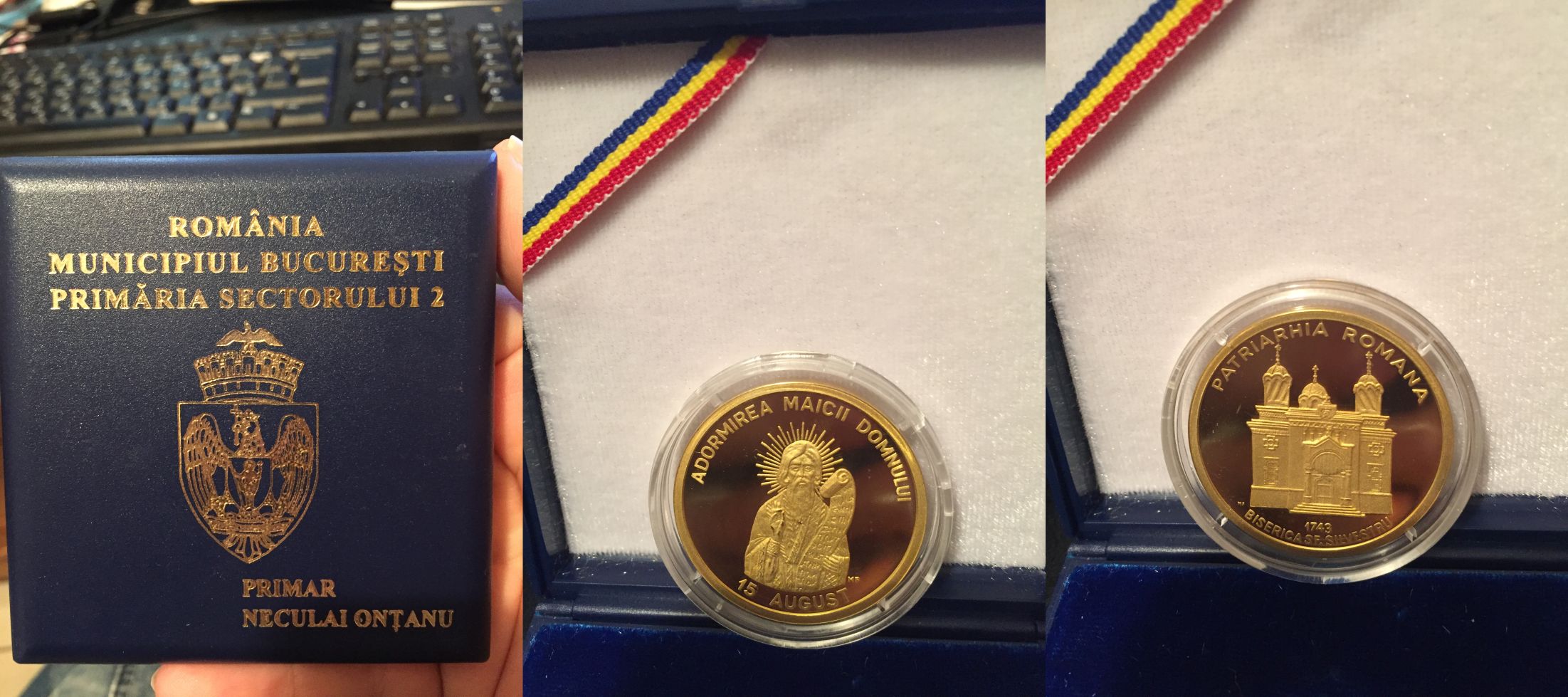 Nu garantez ca am calculat corect . Moneda de aur ar avea 1,67 mm grosime . Pericol de zgariere daca este scoasa pentru a fi masurata . Chiar si un subler prost ( metalic ) o poate strica . Medalia daca ar fi de argint ar trebui sa aiba 2,3 mm grosime iar de ar fi de tombac 2,7 mm . Nu cred ca se poate observa prin plastic mica diferenta ( cam jumate de mm ) intre argint si tombac . Verifica sau valorifica ?