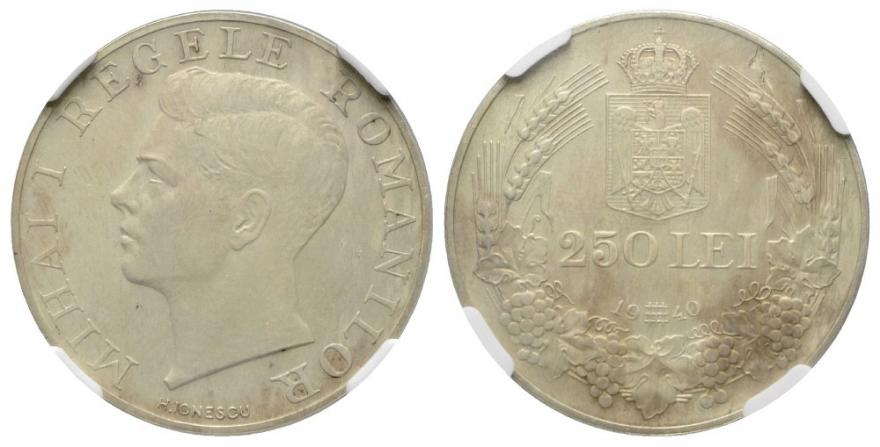 ... cu rugămintea să luăm textul ca fiind un citat și nu opinia mea, dau aici de la SOLIDUS: „This coin originated in one of the most turbulent periods of Rumanian history. In the autumn of 1940, the fascists ('Garda de Fier'), led by Horia Sima, seized power. They immediately commissioned 3 million coins with the symbol of their movement (the iron grid). However, according to internal information from the National Bank of Romania, only about 250 pieces had been minted by the end of December 1940. Rising tensions between the Legion (as the Romanian fascists called themselves) and their former political ally, Marshal Ion Antonescu, led to a showdown with the army between January 21st and 23rd 1941. Crushed, the Legion disbanded and its leaders had to flee into exile. All coins minted up to that point were immediately melted down. According to unconfirmed statements, 5 to 6 specimens survived. These had probably been sent to the leaders of the fascist movement and had remained in their possession. The specimen offered here, graded by NGC as a Proof, most likely originates from the engraver's (Ionescu's) possession and is probably the first strike. Unfortunately, the original luster has been lost as a result of improper cleaning. A restrike after 1989 using original dies is impossible. All restrikes either have no edge inscription or they were made with forged, stylistically quite deviant ring dies.”