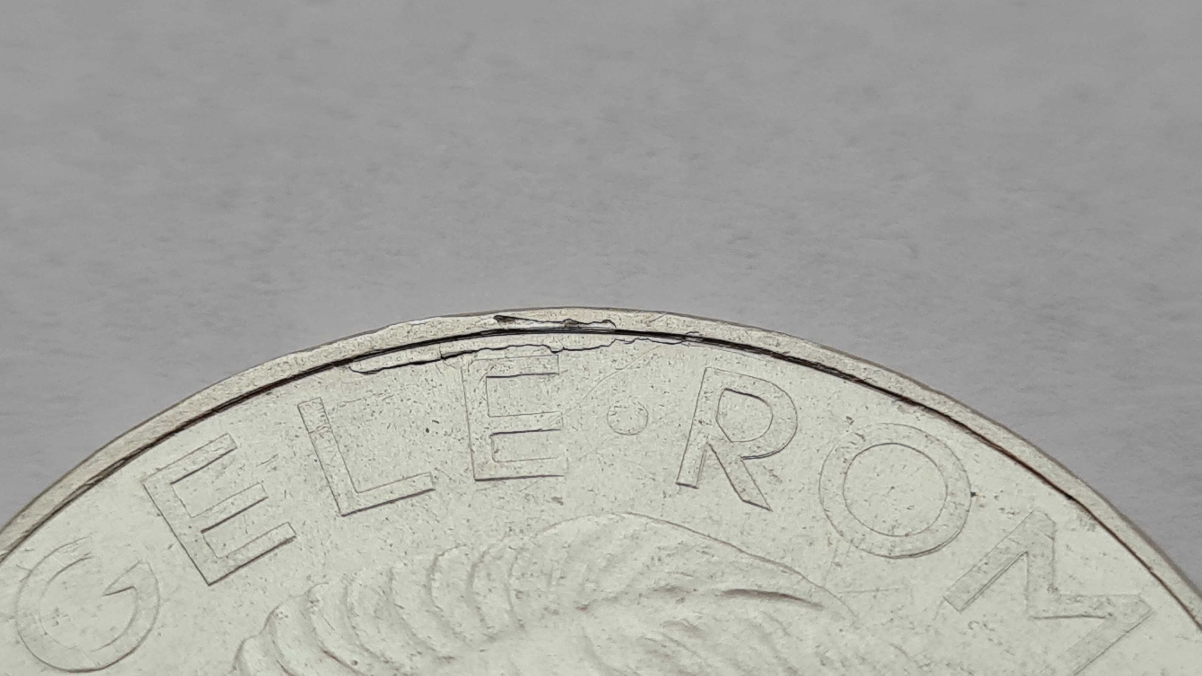 As dori si eu o clarificare, posed urmatoarea moneda si dupa cum se poate vedea exista un defect pe aversul monedei la ora 12, si vroiam sa stiu daca considerati a fi defect de batere( o matrita cu defect) sau sa fie materialul monedei cel cu problema. Se mai poate observa si o dubla batere daca va uitati la literele R O M.