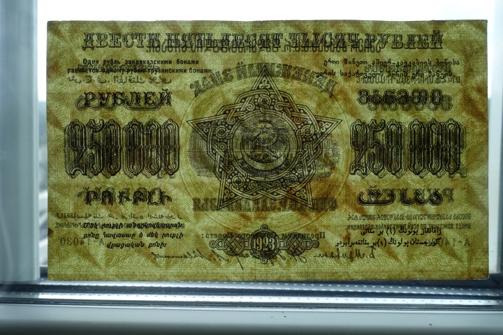 la bancnotele proprii din 1921 (50 ruble, 25.000 ruble, 50.000 ruble, 100.000 ruble) si la cele din Republicca Transcaucazia din 1923.