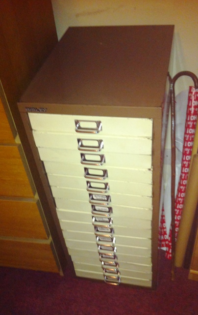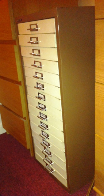 fisier metalic gri, 15 sertare, dim aprox 30x40cm. pret 600 lei.