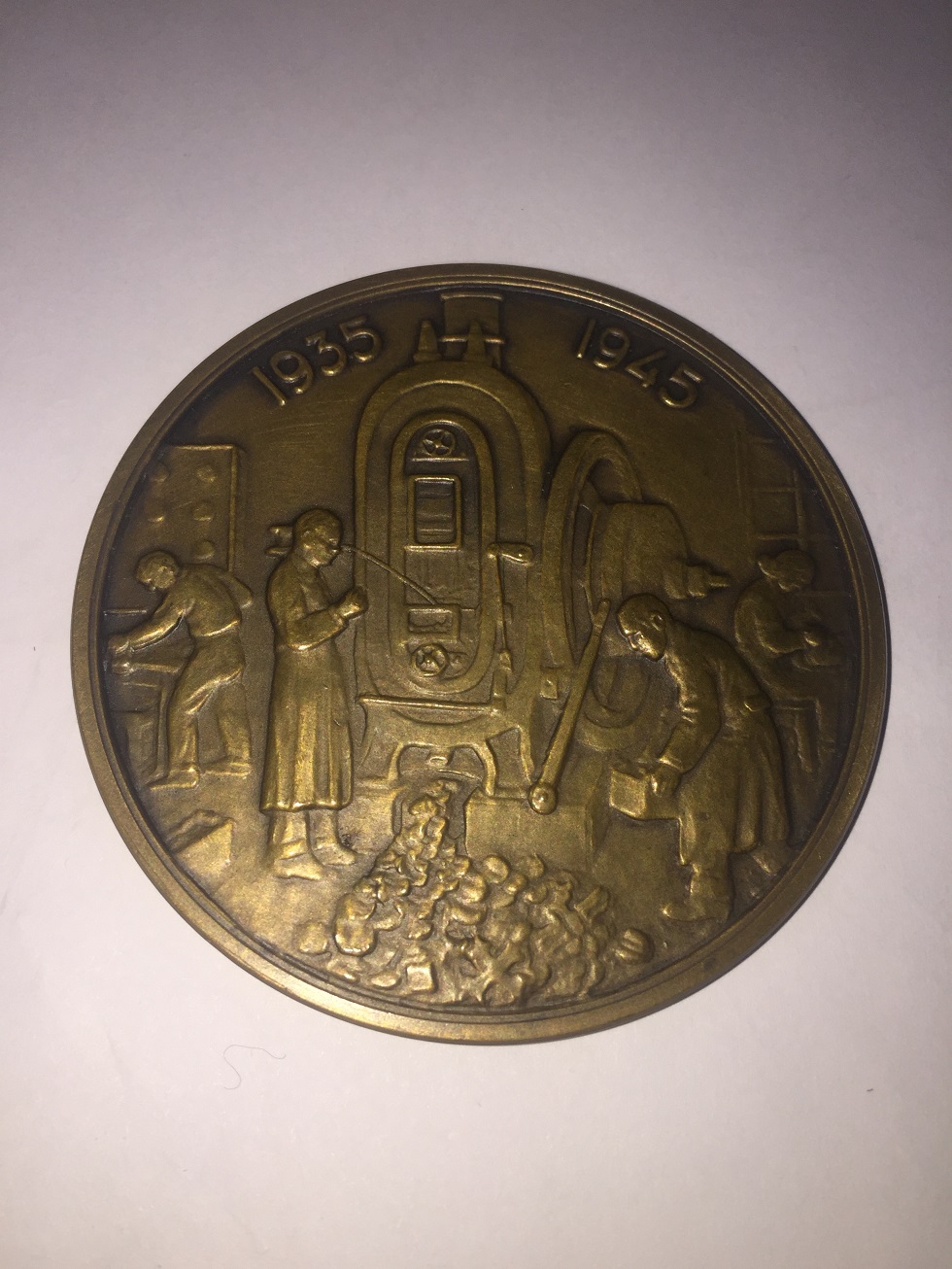 Monetaria Nationala la 10 ani de la reluarea activitatii, bronz patinat, 60 mm, 1945, Top-UNC, la EUR 50,00 plus trimisul.