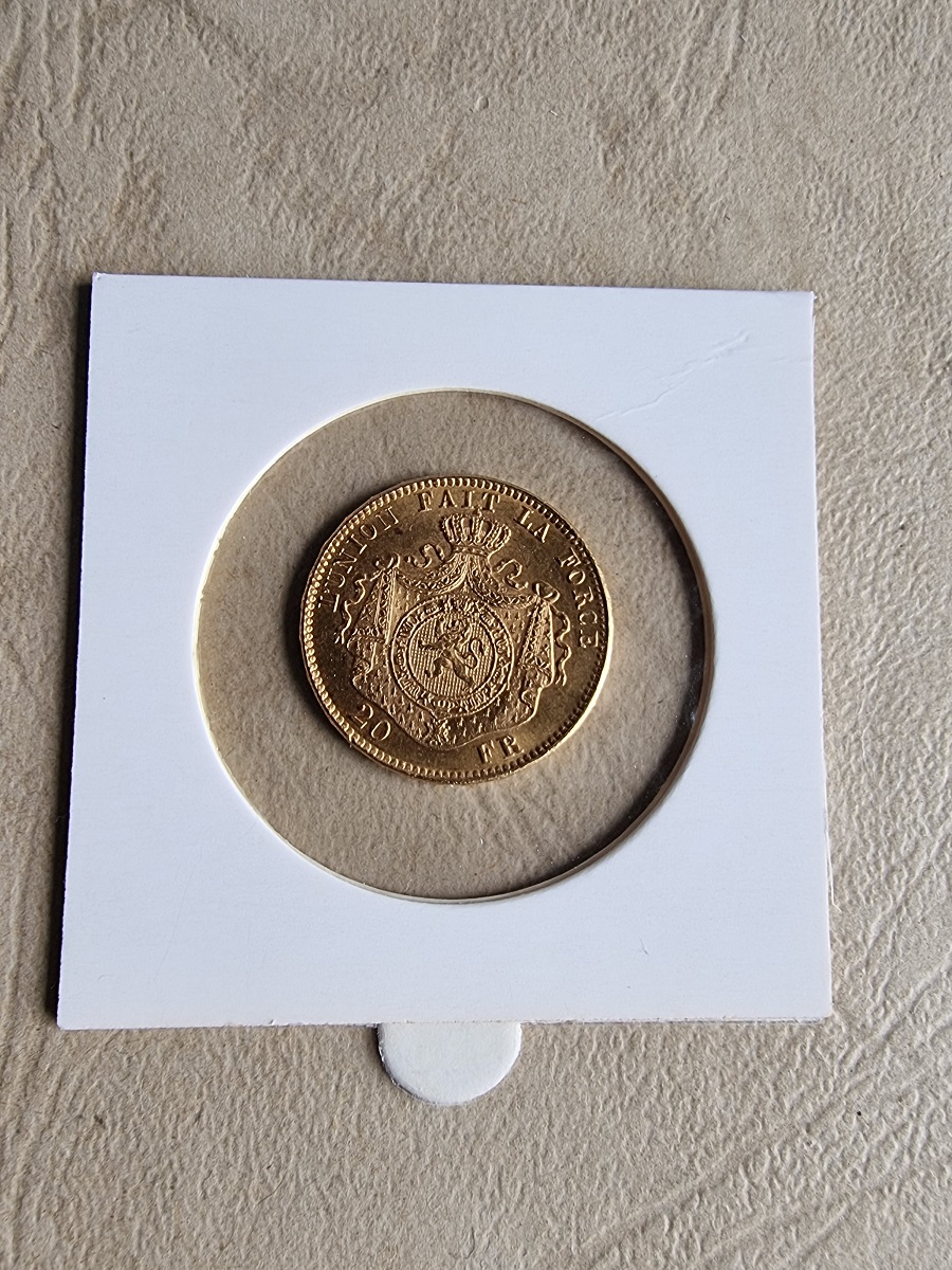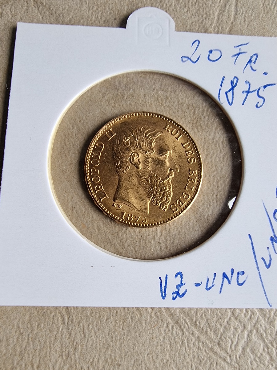 20 Fr. 1875, Leopold II, nefrecata, deci luciu bataie orig., XF-UNC / UNC-.
