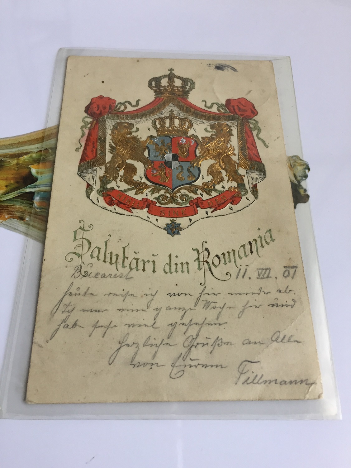 Carte postala ilustrata, Salutari din Romania, stema tarii reliefata, la EUR 68,00 + porto.