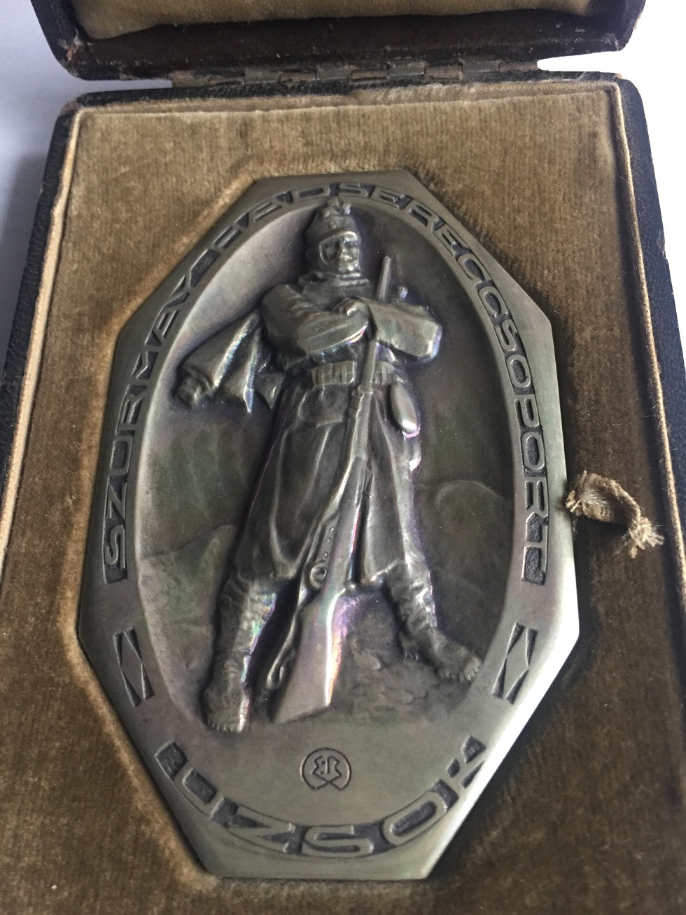 Placheta octagonala a regimentului Szurmay ( fara an, dar WW I ), argint ( marcaj maghiar si 990 ), fara greseala pe muchie, in etuiul original.