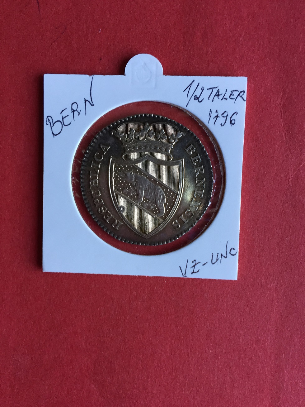 1/2 Taler 1796, cantonul Berna, argint, 14,67g, campuri proof like, relief mat, fara probleme la muchie, patina fina, XF-UNC, EUR 425,00 cu pachet DHL inclusiv.