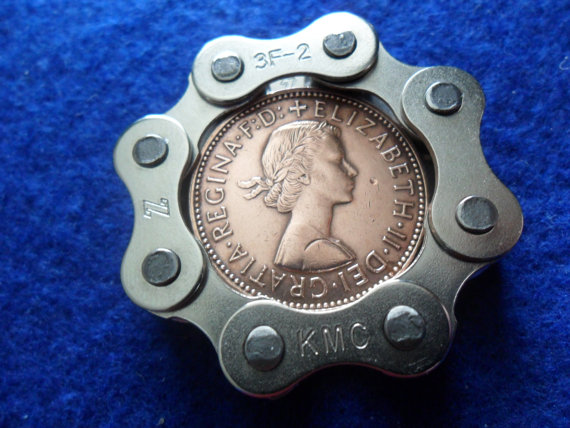 pe piaţă sunt şi "miniaturi" cu monede încorporate "tematic": în imagine o monedă încorporată într-o bucată de bicicletă (şi nu o bicicletă într-o monedă)