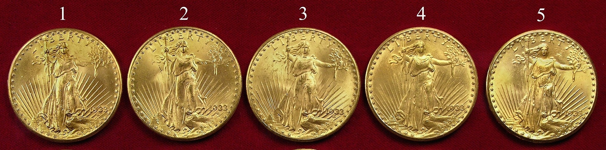 Prin contrast, monedele Double Eagle 1933 au fost emise înainte de ordinul de retragere al lui Roosevelt, astfel încât acestea pot fi deţinute în mod legal de către cetăţeni. Cu toate acestea, se estimează că nu există mai mult de 40 dintre acestea, restul fiind topite, ceea ce le face extrem de rare.